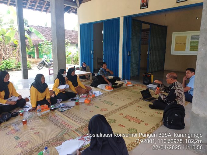 Dinas Pertanian dan Ketahanan Pangan Daerah Istimewa Yogyakarta (DIY) menyelenggarakan Kegiatan Sosialisasi Konsumsi Pangan Beragam, Bergizi, Seimbang, dan Aman (B2SA) yang dilaksanakan di dua lokasi, yakni Padukuhan Karangmojo, Bejiharjo, Karangmojo, Gunungkidul, serta PKK Padukuhan Gedongan, Sumberagung, Moyudan, Sleman, pada Jumat, 22 April 2025. Kegiatan ini menghadirkan narasumber dari Fakultas Teknologi Pertanian (FTP) Universitas Gadjah Mada (UGM), Bambang Dwi Wijatniko, S.T.P., M.Agr.Sc., M.Sc., Ph.D., yang memaparkan materi mengenai pentingnya diversifikasi konsumsi pangan berbasis sumber daya lokal.