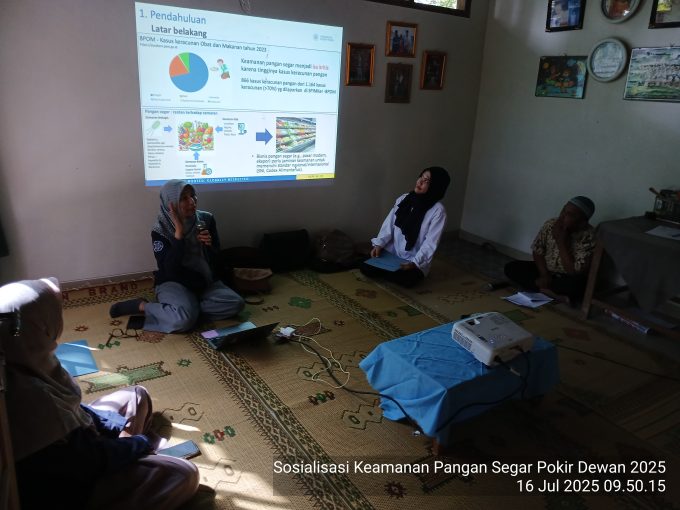 Materi yang disampaikan dalam sosialisasi meliputi tiga topik utama yang relevan dengan kebutuhan masyarakat. Pertama, mengenai kondisi keamanan pangan segar di Indonesia saat ini, yang memaparkan situasi nasional terkait kualitas, standar, serta tantangan distribusi pangan segar di tengah meningkatnya kebutuhan konsumen. Kedua, penjelasan mengenai sumber dan ancaman bahaya cemaran pada pangan segar, yang dapat berasal dari faktor biologis, kimia, maupun fisik, sehingga penting untuk diantisipasi agar tidak membahayakan kesehatan masyarakat. Ketiga, pembahasan mengenai praktik pemilihan, penyimpanan, dan pengolahan pangan segar yang baik, yang dapat menjadi pedoman praktis bagi masyarakat maupun pelaku usaha dalam menjaga mutu pangan hingga sampai ke tangan konsumen.
