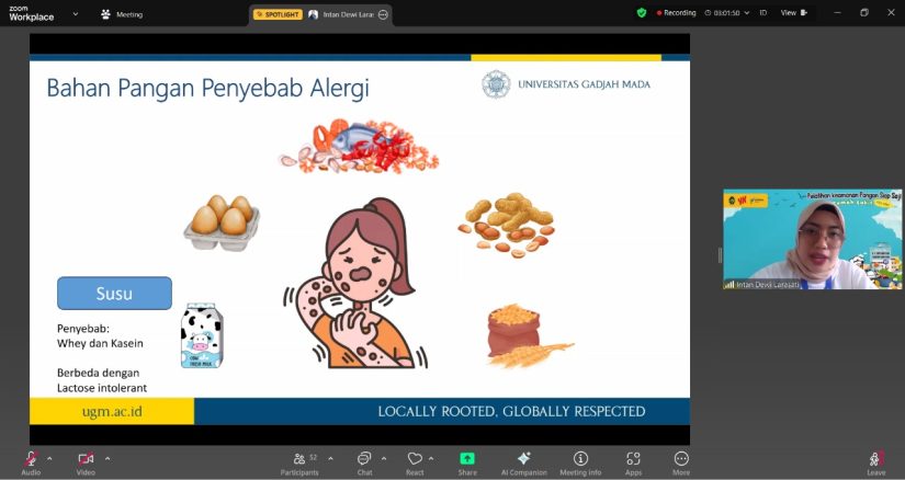 Dalam sesi materi yang disampaikan, Intan Dewi Larasati, S.T.P., M.Sc., membahas mengenai berbagai potensi cemaran bahan pangan, baik fisik, kimia, maupun mikrobiologi, yang dapat memengaruhi mutu serta keamanan makanan. Materi tersebut diharapkan dapat membantu para penjamah pangan untuk mengenali risiko sejak dini, menerapkan standar higiene dan sanitasi yang tepat, serta mengelola rantai penyajian pangan secara lebih aman dan berkualitas.