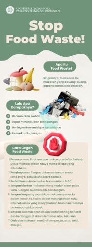 Fakultas Teknologi Pertanian (FTP) Universitas Gadjah Mada (UGM) terus berkomitmen dalam mendukung upaya keberlanjutan dan ketahanan pangan melalui pelaksanaan edukasi mengenai food waste di lingkungan fakultas. Upaya ini dilakukan sebagai bentuk kepedulian terhadap isu pemborosan pangan yang berdampak pada lingkungan, ekonomi, dan keberlanjutan sumber daya.